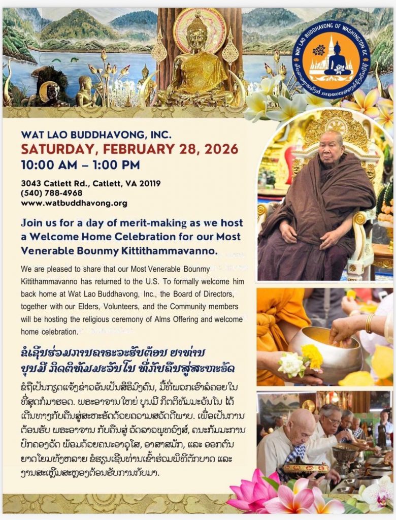 We are pleased to share that our Most Venerable Bounmy Kittithammavanno has returned to the U.S. To formally welcome him back home at Wat Lao Buddhavong, Inc., the Board of Directors, together with our Elders, Volunteers, and the Community members